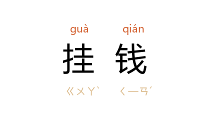 ⒈ 亦作“掛钱”。 北京 旧俗于农历年初一在门首窗前贴挂钱,至二月二日打落弃去。挂钱用长尺许、宽四五寸的红或黄棉纸做成,上雕镂钱形花纹或吉祥文字。