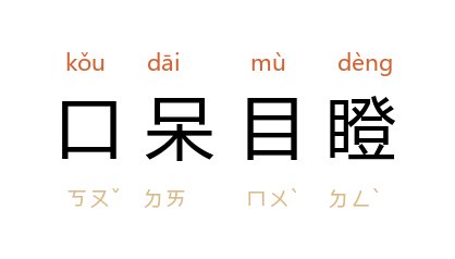 引鲁迅 《且介亭杂文末编·答徐懋庸并关于抗日统一战线问题》:“转向者的言谈,到左联就奉为圣旨,这真使我口呆目瞪。”亦作“口呆目钝”。 克非 《春潮急》二五:“张福寿 顿时口呆目钝,半天才小声说:‘我晓得的喃!我又没去戴过红花、吃过油大。’”