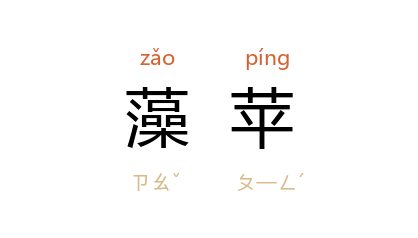 引南朝 梁 萧衍 《首夏泛天池》诗:“舟楫互容与,藻苹相推移。”唐 黄滔 《祭陈先辈》:“昨辰而椒桂献酬,今日而藻苹滴沥。”明 屠隆 《綵毫记·官兵大捷》:“惊魂九庙,废伏腊之藻苹。”