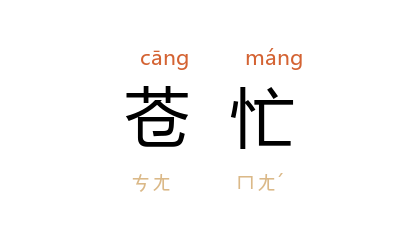 引唐 张彦远 《历代名画记·张璪》:“值 朱泚 乱,京城骚扰, 璪 亦登时逃去,家人见画在帧,苍忙掣落。”宋 洪迈 《夷坚丁志·西池游》:“逻卒躡寻,见 周 意状苍忙,而污血被体,共执送官。”元 耶律楚材 《再过西域山城驿》诗:“主人欢喜铺毛毯,驛吏苍忙洗瓦鐘。”