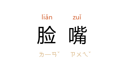 引《英烈传》第十五回:“雕弓半折,将来弹不动棉花;护镜亏残,拿去照不成脸嘴。”《平山冷燕》第十八回:“张寅 也顾不得,竟遮掩着直往外走,也没甚脸嘴去见 山显仁。”张天翼 《皮带》:“‘哪个 老熊 ?’ 炳生先生 要表示自己跟在座的是一伙,装了很熟悉似的脸嘴问。”