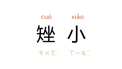 引宋 洪迈 《夷坚丁志·江南木客》:“新城县 中田村 民 李氏 妾生子,躯干矬小,面目睢盱如猴,手足仅寸,不类人。”萧军 《军中》二:“屋子矬小而潮湿,挨近墙根有大小的耗子洞穴。”