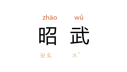 ⒈ 谓致力于武备。显扬武威。古舞名。隋·唐时的政权名。在今中亚·阿姆、锡尔两河流域,有康、安、曹、石、米、何、火寻、戎地、史,均为康居之后。其先康王旧居祁连山北昭武城,被匈奴所破,西逾葱岭至两河流域,子孙繁衍,分王九国,并以昭武为姓,示不忘本,总称昭武九姓。参阅《隋书·西域传·康国》。