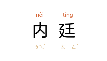 ⒉ 内朝。对外廷而言。清代内廷指干清门内,皇帝召见臣下、处理政务之所。军机处、南书房等重要机构均设于此。