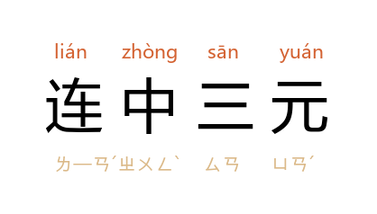 ⒈ 三元,指解元、会元、状元,分别为科举制度下乡试、会试、殿试的第一名。连中三元指接连在乡试、会试与殿试中考取第一名。