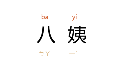 引《旧唐书·后妃传上·玄宗杨贵妃》:“﹝ 贵妃 ﹞有姊三人,皆有才貌, 玄宗 并封国夫人之号:长曰大姨,封 韩国 ;三姨,封 虢国 ;八姨,封 秦国。并承恩泽,出入宫掖,势倾天下。”宋 苏轼 《虢国夫人夜游图》诗:“坐中八姨真贵人,走马来看不动尘。”元 耶律楚材 《怀古一百韵寄张敏之》:“裂土封三国,缠头爱八姨。”