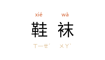 ⒈ 亦作“鞋韈”。鞋子与祙子。亦偏指鞋子。