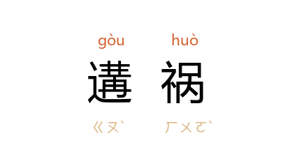 引《后汉书·孔融传》:“故 鼂错 念国,遘祸於 袁盎 ; 屈平 悼 楚,受譖於 淑 兰。”宋 曾巩 《学舍记》:“天倾地坏,殊州独哭,数千里之远,抱丧而南,积时之劳,乃毕大事,此予之所遘祸而忧艰也。”