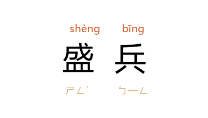 引《史记·淮阴侯列传》:“魏王 盛兵 蒲坂,塞 临晋。”明 宋濂 《浙东行省右丞李公武功记》:“虏盛兵东向,而使游兵泝 钓台 以缀我师。”北魏 郦道元 《水经注·梓潼水》:“昔 岑彭 与 臧宫 自 江州 从 涪水 上。 公孙述 令 延岑 盛兵于 沉水,宫 左步右骑夹船而进,势动山谷,大破 岑 军。”