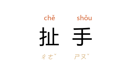 引《儒林外史·第三五回》:「侯庄征君坐稳了,两个太监笼著缰绳,那扯手都是赭黄颜色,慢慢的走过了干清门。」《儿女英雄传·第四回》:「只见驴上那人把扯手往怀一带,就转过山坡儿过山后去了不提。」