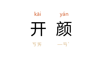 ⒈ 容颜开朗。形容心情愉快。唐·韩愈〈记梦〉诗:「神官见我开颜笑,前对一人壮非少。」宋·欧阳修〈蓦山溪·新正初破〉词:「天涯情绪,对酒且开颜,春宵短。」也作「启颜」。