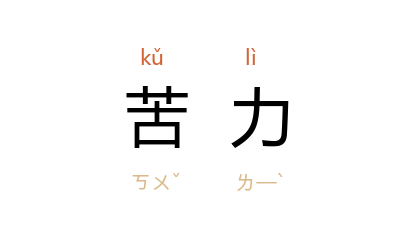 英语bitter work, hard toil, (loanword) coolie, unskilled Chinese laborer in colonial times