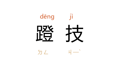 ⒈ 一种传统的杂技节目。演员仰卧,两足向上,推动所蹬之物,使之旋转、翻滚,也可使之平衡而不倒。有蹬缸、蹬桌、蹬人、蹬伞、蹬梯等种种花样。