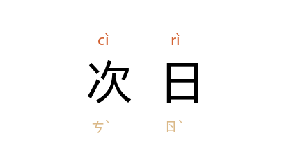 引《水浒传·第二三回》:「次日早起来,打火吃了饭,还了房钱。」《文明小史·第二四回》:「次日出口,风平浪静,两人凭栏看看海中景致。」