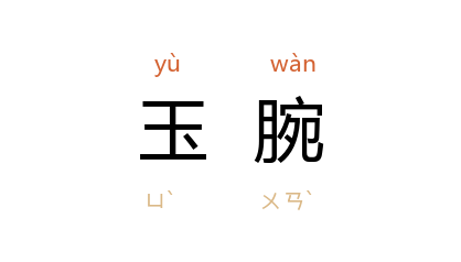 引南朝 宋 刘铄 《白紵曲》:“仙仙徐动何盈盈,玉腕俱凝若云行。”唐 王勃 《采莲曲》:“桂棹兰橈下长浦,罗裙玉腕摇轻櫓。”宋 苏轼 《谢郡人田贺二生献花》诗:“玉腕揎红袖,金罇泻白醅。”清 刘献廷 《数珠》诗:“百人数珠缠玉腕,爱他名唤美人蕉。”