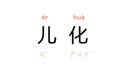 ⒈ 一字后附「儿」字语尾,读时「儿」与前字相拼,成卷舌韵,相拼时有种种变化,称为「儿化」。如圈儿不读作ㄑㄩㄢㄦˊ而读作ㄑㄩㄚㄦ,牌儿不读作ㄆㄞㄦˊ而读作ㄆㄚˊㄦ。