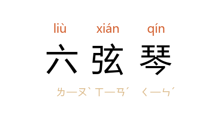 ⒈ 乐器名。有六根弦,用指拨弹。十九世纪初流行于欧洲,后传入我国。曾译作“六弦琵琶”。亦称“吉他”(guitar)。