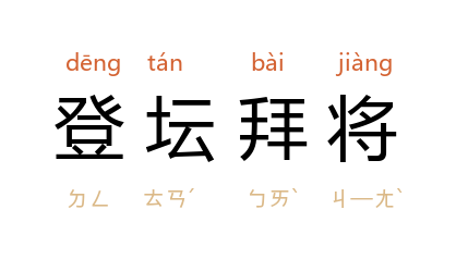 ⒈ 古代任命将帅时的隆重仪式。汉萧何推荐韩信给汉王,汉王将拜为大将。萧何说:「王必欲拜之,择良日,斋戒,设坛场,具礼,乃可耳。」见《史记·卷九二·淮阴侯传》。后喻指任命将帅。唐·杨烱〈唐昭武校尉曹君神道碑〉:「贞观八年,诏特进代国公李靖为行军大总管。登坛拜将,授钺行师。」也作「登台拜将」。