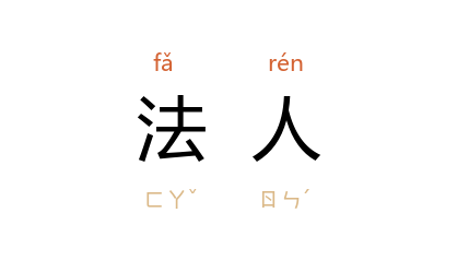 ⒈ 一社会组织体,在法律上得为权利义务的主体。与自然人同为法律上所谓的人。法人的种类,依设立法规可分为公法人与私法人;依成立要件可分为社团法人与财团法人;依设立的目的,可分为公益法人与营利法人。