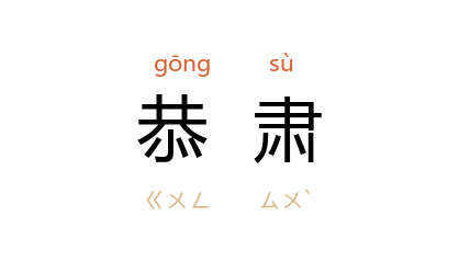 引《后汉书·皇后纪上·和熹邓皇后》:“恭肃小心,动有法度。”宋 俞成德 《萤雪丛说·祝贺生辰》:“伊川 生日,致斋恭肃,不事饮燕歌乐。”清 毛岳 《台湾县知县姚君墓志铭》:“自起居衣服,壹意恭肃。门以内,虽童稚皆谨声息。”冰心 《寄小读者》二三:“清明扫墓,虽不焚化纸钱,也可以训练小孩子一种恭肃静默的对先人的敬礼。”