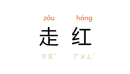 引李六如 《六十年的变迁》第二卷第十章:“﹝ 高遂耿 ﹞张开两片又厚又粗的大嘴唇:‘听说你在教育界走红啦。’”陈荒煤 《刘麻木》:“人走红,太岁头上也动得土。”
