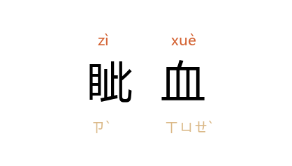 引《文选·卢谌<览古>诗》:“眥血下霑襟,怒髮上衝冠。”李周翰 注:“相如 怒而目眥血下,髮上衝冠。”宋 王安石 《忆昨诗示诸外弟》:“精神流离肝肺絶,眥血被面无时晞。”