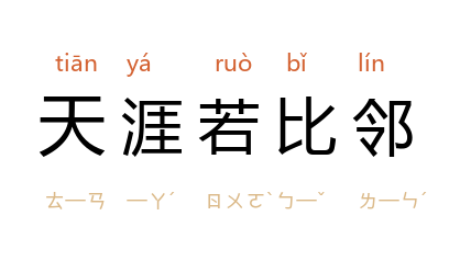 ⒈ 原为唐诗一句。王勃《送杜少府之任蜀州》:“海内存知己,天涯若比邻。”现在常用来表达对远方友人的情谊,特指对外国人的情谊。