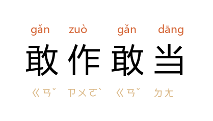 引《三侠五义》第七五回:“敢作敢当,才是英雄好汉。”《两地书·许广平<致鲁迅十八>》:“敢作敢当,也是不可不有的精神。”