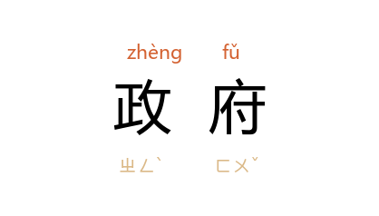 ⒉ 国家统治机关的总称,为近代国家构成要素之一。凡具有制定法律及执行法律之权力的政治组织,称为「政府」。