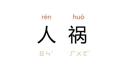 引汉 刘向 《列女传·鲁公乘姒》:“不达人事而相国,非有天咎必有人祸,子其勿为也。”唐 韩愈 《答刘秀才论史书》:“夫为史者,不有人祸则有天刑。”清 唐甄 《潜书·性功》:“天灾伤稼,人祸伤财,冻馁离散,不相保守,性何以通!”