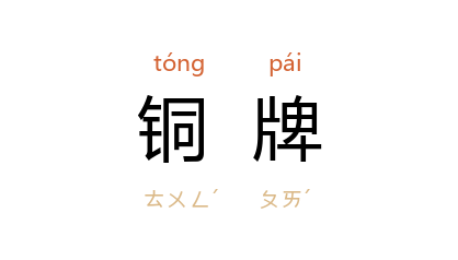 ⒈ 铜质的牌子。经常用来制成各种形状的奖牌,上面刻字,可作奖品或纪念品,便于保存陈列。