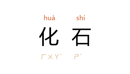 ⒋ 保存于地层中的古生物遗体、遗物或遗迹,埋藏在地下,经过自然界的作用,变化而成的保留原物体、遗迹形状、结构或印模的钙化、碳化、硅化、矿化的东西。研究化石可了解生物的发展情况,并能据以确定地层的年代。