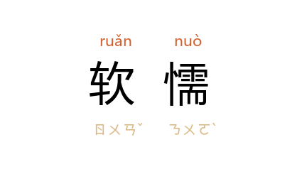 引北齐 刘昼 《新论·和性》:“人之含性,有似於兹:刚者伤於严猛,柔者失於软懦。”宋 苏舜钦 《诣匦疏》:“此二人者,皆登高第,本望以词华进用,素復温和輭懦,无刚鯁敢言之才。”