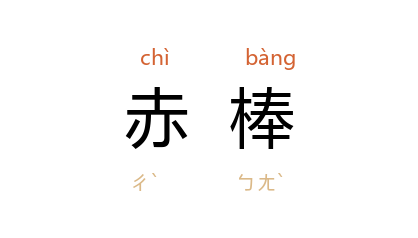 ⒈ 赤色的棒。古代大官出行,前导仪仗中兵器之一。