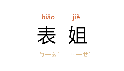 ⒈ 姑母、舅父、姨母之女年长于己者,称表姐。