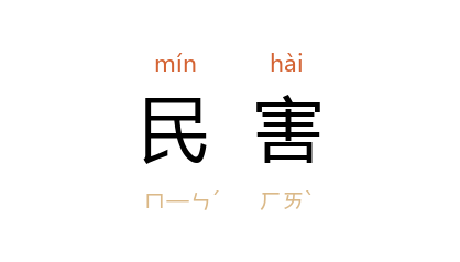 引《后汉书·五行志一》:“元嘉 中, 凉州 诸 羌 一时俱反……大为民害。”宋 司马光 《涑水记闻》卷十六:“是岁冬, 侠 上书,几五千言,极陈时政得失,民间疾苦,且言 王安石 作新法为民害。”