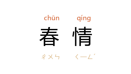 ⒈ 春天的情景、意兴。南朝梁·萧子范〈春望古意〉诗:「春情寄柳色,鸟语出梅中。」唐·李群玉〈感春〉诗:「春情不可状,艳艳令人醉。」也作「春恋」。