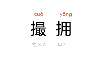 引《西游记》第九三回:“那长老被众宫娥等撮拥至楼前。”《红楼梦》第十四回:“凤姐 下了车,一手扶着 丰儿,两个媳妇执着手把灯照着,撮拥 凤姐 进来。”