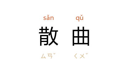⒈ 对剧曲而言,凡无科白而只供清唱的,称为「散曲」。盛于元代,又分小令与散套二种。