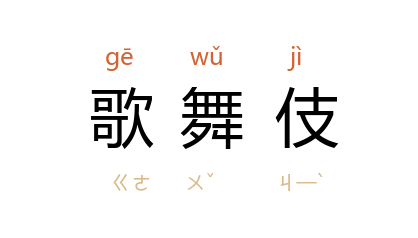 ⒈ 一种日本古典戏剧。表演时,演员穿戴古衣冠、绘脸谱,动作和装扮带有夸张性。场上人物只表演动作和说白,另有歌者在旁伴唱。传统剧目中有《劝进帐》等十八出著名作品,称为「歌舞伎十八番」。