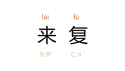⒈ 来回、往复。本指易道中由剥至复的过程。易经剥卦坤下艮上,仅剩上九一阳爻,卦气上升,转为坤卦,坤下坤上,一阳不余,转至复卦,震下坤上,初九一阳始生。故由剥之上九一阳将尽至复卦一阳始生,来复七爻,于时可代表七日。唐·孔颖达·正义:「阳气始剥尽,谓阳气始于剥尽之后至阳气来复时,凡经七日。」后亦用来代表七天的循还周期。称一星期为一个来复,星期日为「来复日」。