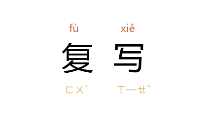 ⒉ 把复写纸夹在两张或几张纸之间书写,一次可以写出若干份。因用以比喻事物的重现或重演。