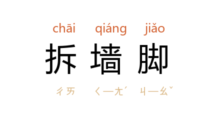 例如:「在计划完成之前,我们要预防他拆墙脚,以免前功尽弃。」
