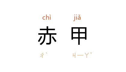 ⒈ 红色的甲。古代谶纬家谓为帝王受命的祥瑞。语本《尚书中候》:“龙马衔甲,赤文緑色,甲似背,袤广九尺,上有列宿斗正之度,帝王録纪兴亡之数。”见杜预《〈春秋经传集解〉序》“凤鸟不至,河不出图”唐孔颖达疏引。