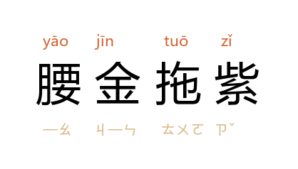 ⒈ 身穿紫袍,腰佩金鱼袋,为古代官员打扮。比喻当大官。唐·白居易〈哭从弟〉诗:「一片绿衫消不得,腰金拖紫是何人?」也作「衣紫腰金」。