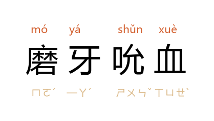 引唐 李白 《蜀道难》诗:“朝避猛虎,夕避长蛇,磨牙吮血,杀人如麻。”明 刘基 《雷说上》:“磨牙吮血,朘膏刮骨。”康有为 《大同书》癸部第一章:“且若并草木而戒杀,则人将立死,可三日而成为狉榛之世界,野兽磨牙吮血,徧於全地。”