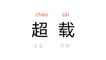 ⒈ 交通工具装载人客或货物,超过法令规定的人数、重量或长度、宽度、高度等情形,称为「超载」。