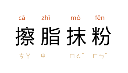 ⒈ 化妆打扮。也作「抹粉施脂」、「搽脂抹粉」。