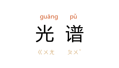 ⒈ 光通过棱镜或光栅等装置,引起色散现象,而成单色光排列的光带,称为「光谱」。如太阳光线分散所成的色带,有红、橙、黄、绿、蓝、靛、紫七色。自然界中各种元素都有其独特的光谱,可由物质的光谱中,测知其分子结构与组成。