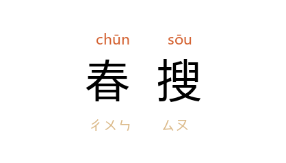 引《左传·隐公五年》:「故春搜、夏苗、秋狝、冬狩,皆于农隙以讲事也。」《三国演义·第二〇回》:「古之帝王,春搜夏苗,秋狝冬狩,四时出郊,以示武于天下。」
